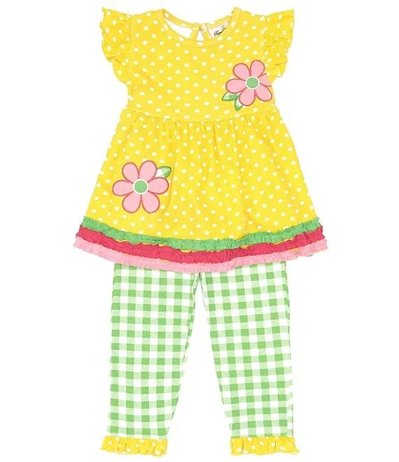 Little Girls 2T-6X Flutter Sleeve Dotted Knit Flower-Appliqued Dress & Checked Leggings Set