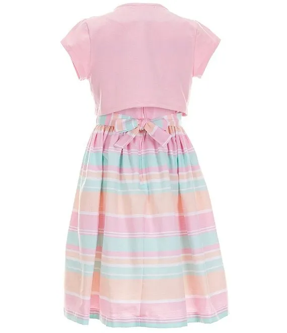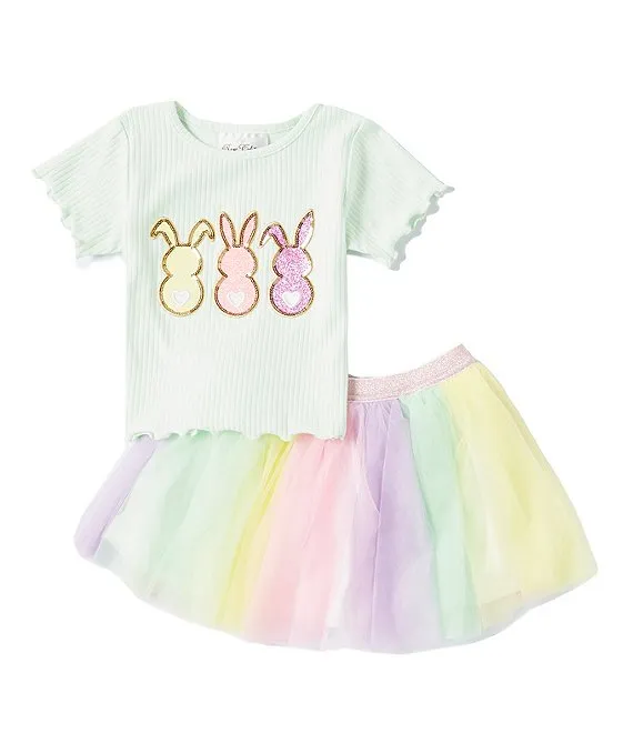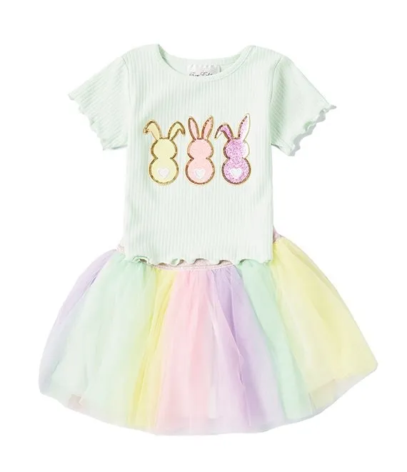 Little Girls 2T-6X Short Sleeve Bunny Artwork Knit T-Shirt & Rainbow Mesh Tutu Skirt Set