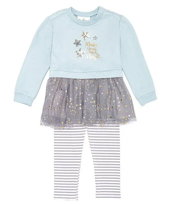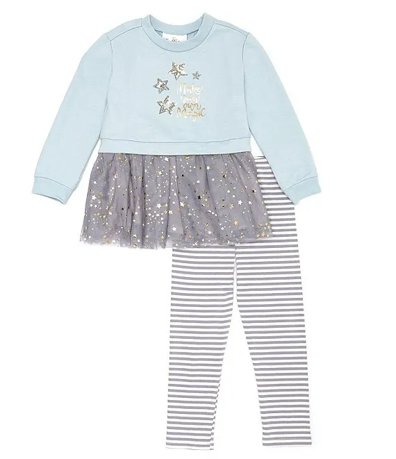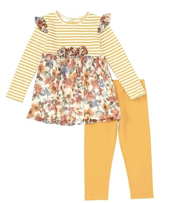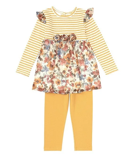 Bonnie Jean Little Girls 2T-6X Long Sleeve Striped/Floral Mixed-Media Fit-And-Flare Dress & Solid Leggings Set