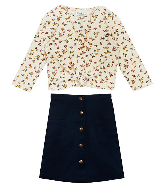 Big Girls 7-16 Long Sleeve Waffle Floral Top with Denim Vest & Skirt 4-Piece Set