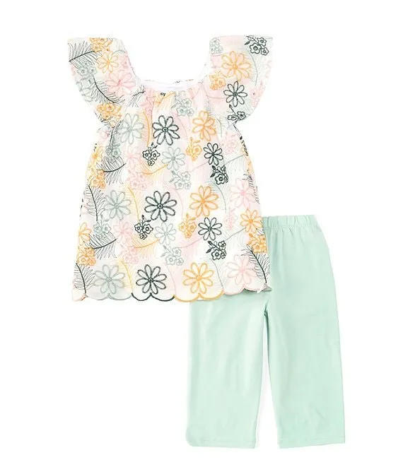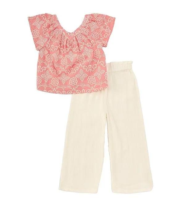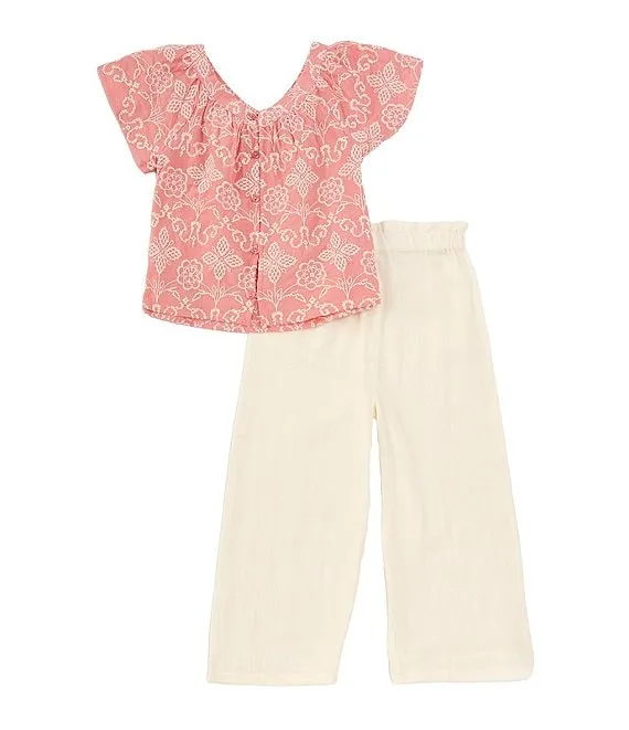 Little Girls 2T-6X Flutter-Sleeve Patterned Woven Top & Solid Gauze Capri Pant Set