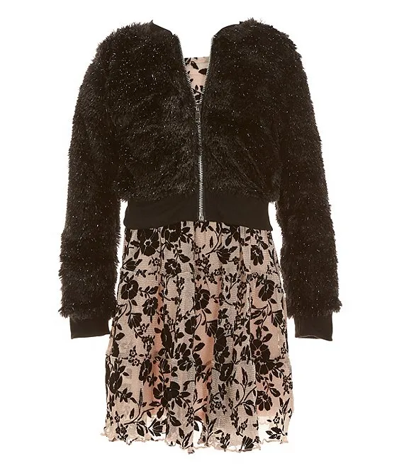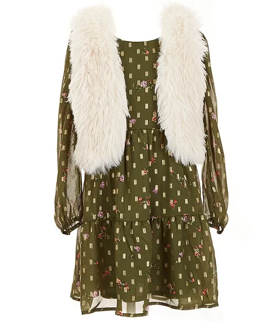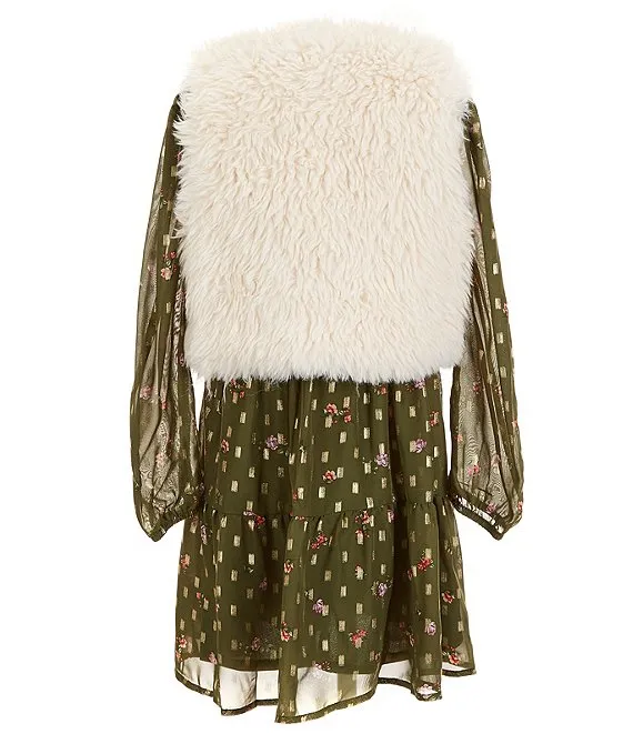 Big Girls 7-16 Long Sleeve Foiled Printed Chiffon Baby Doll Dress & Faux-Fur Vest Set