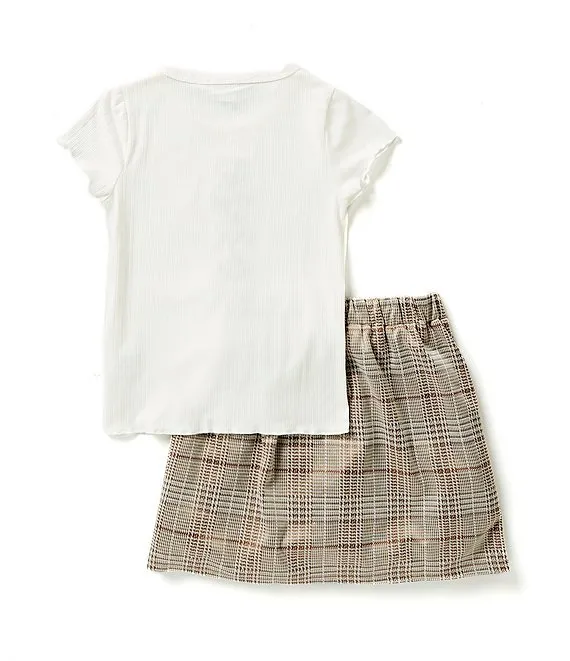 Big Girls 7-16 Short Sleeve Solid Rib Knit Tee & Plaid Inverted Pleat Skort Set