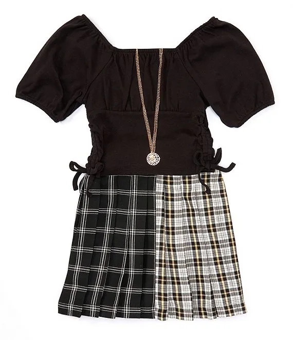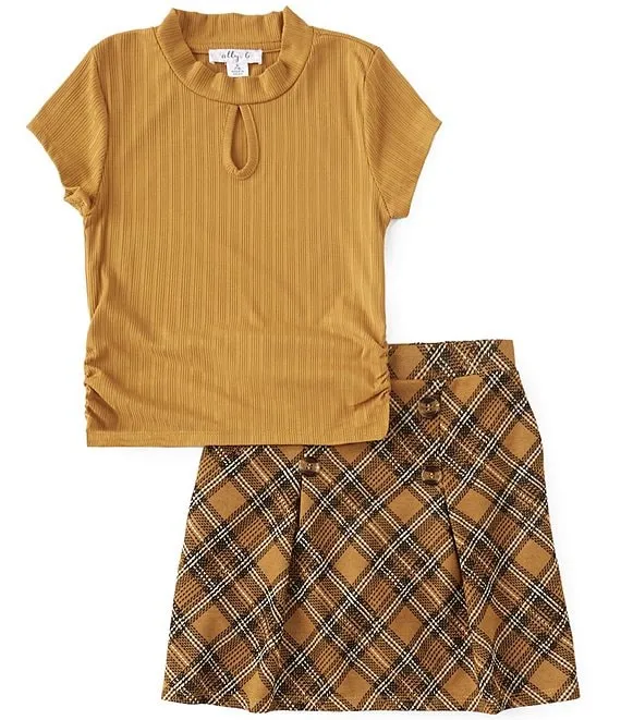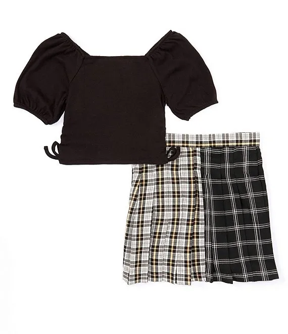 Big Girls 7-16 Short Sleeve Solid Cinched Side Top & Mixed Plaid Skirt Set