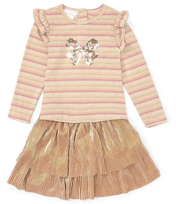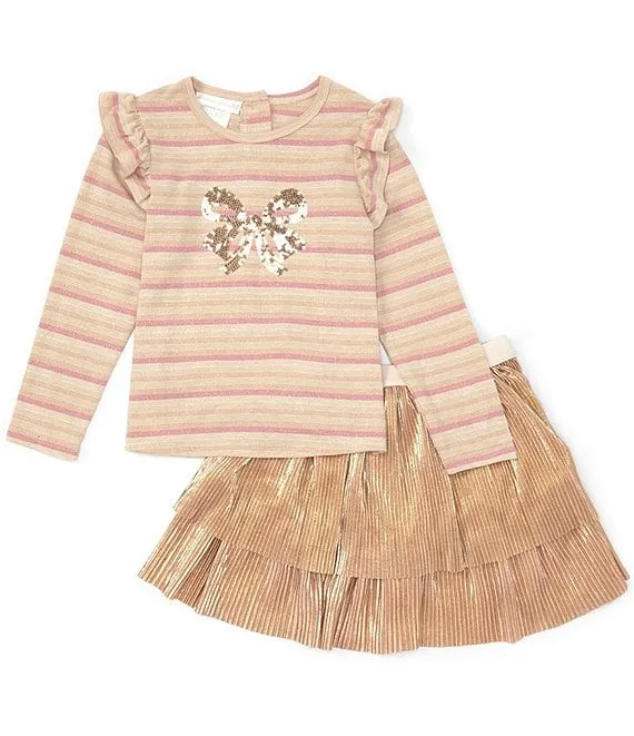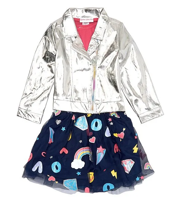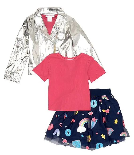 Little Girls 2T-6X Long-Sleeve Metallic Jacket With Long Sleeve Knit T-Shirt & Printed Skirt Set