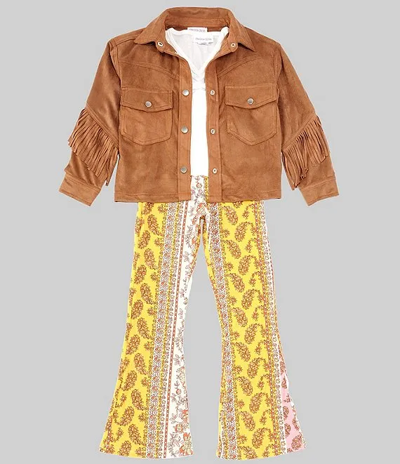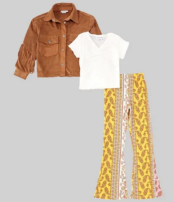 Big Girls 7-16 Long Sleeve Fringe Faux-Suede Trimmed Shacket, Rib Knit Tee & Mixed Media Printed Flare Leg Pant Set