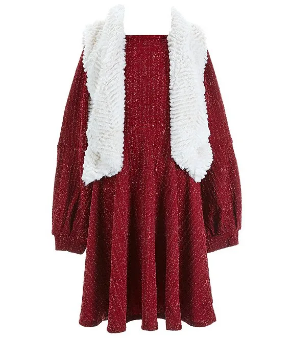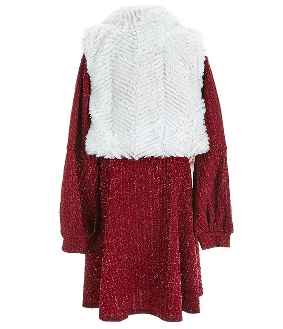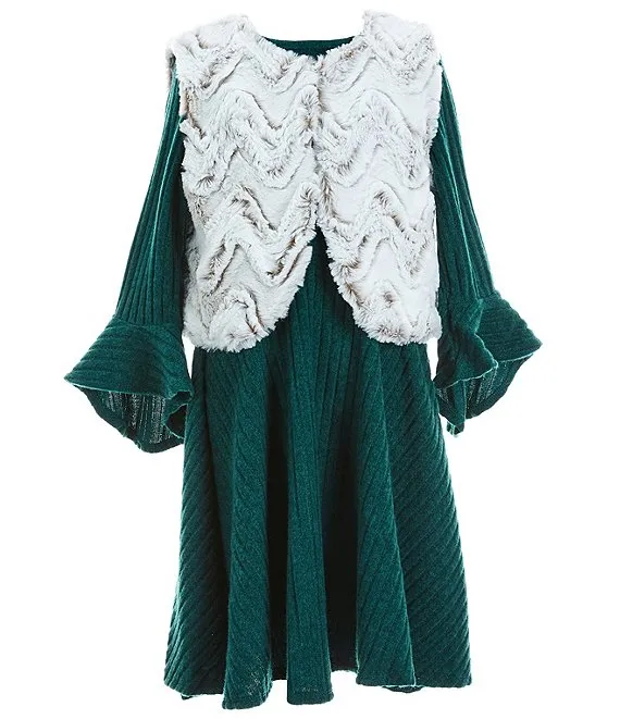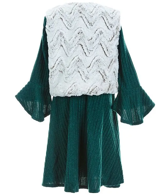 Big Girls 7-16 Sleeveless Printed Faux Fur Vest & Bell Sleeve Brushed Knit Shift Dress Set
