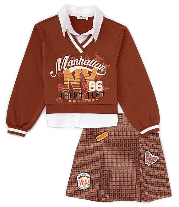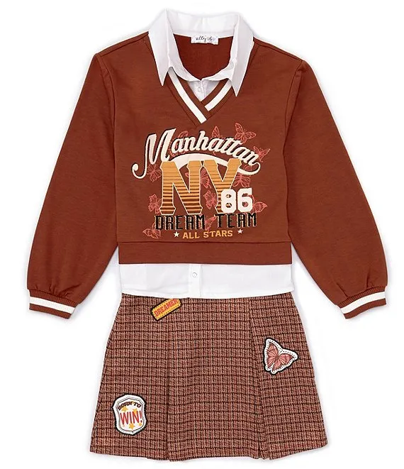 Big Girls 7-16 Layered-Look Two-Fer Point Collar Long Sleeve Top & Checked Inverted Pleat Skirt Set
