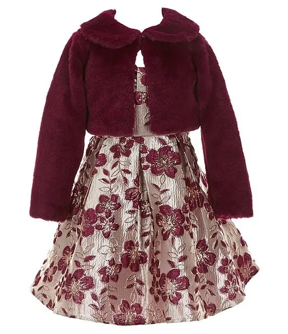 Little Girls 4-6X Long-Sleeve Faux-Fur Bolero Jacket & Sleeveless Floral Brocade Fit-And-Flare Dress Set