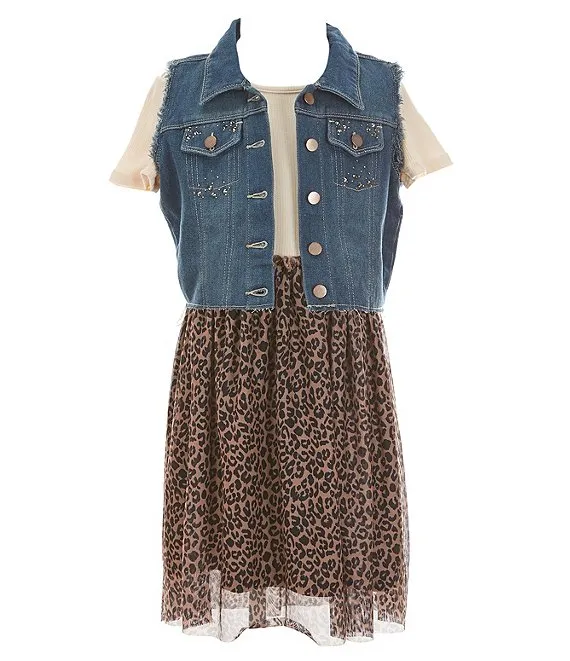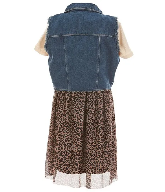 Little Girls 2T-6X Sleeveless Denim Vest & Short-Sleeve Solid Knit/Animal-Printed Fit-And-Flare Dress Set
