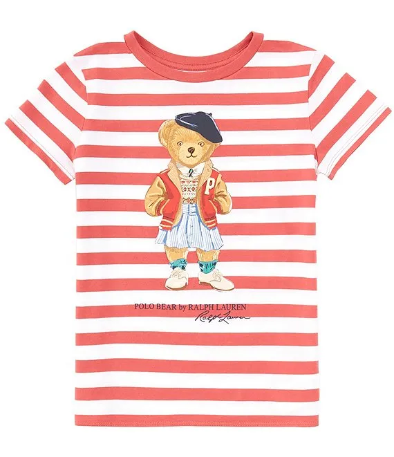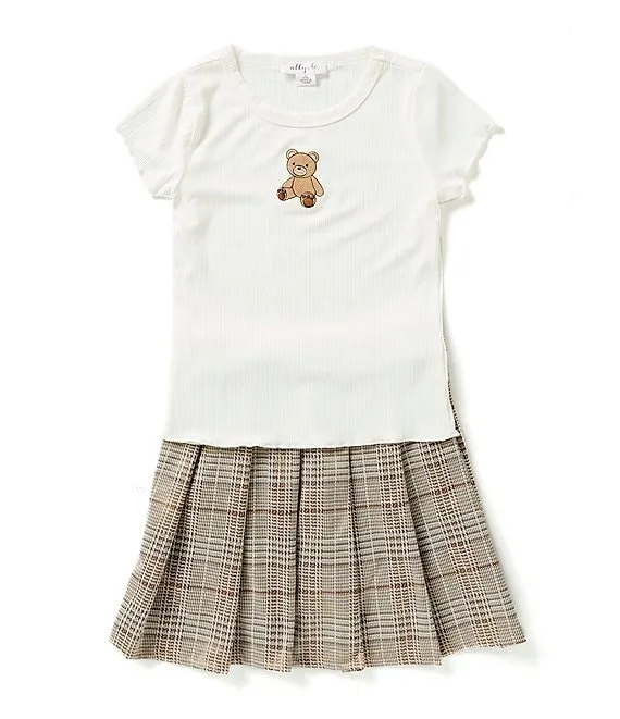Big Girls 7-16 Short Sleeve Teddy Bear Embroidered Tee & Plaid Pleated Skirt Set
