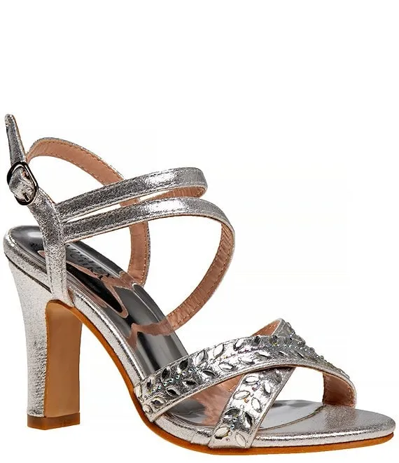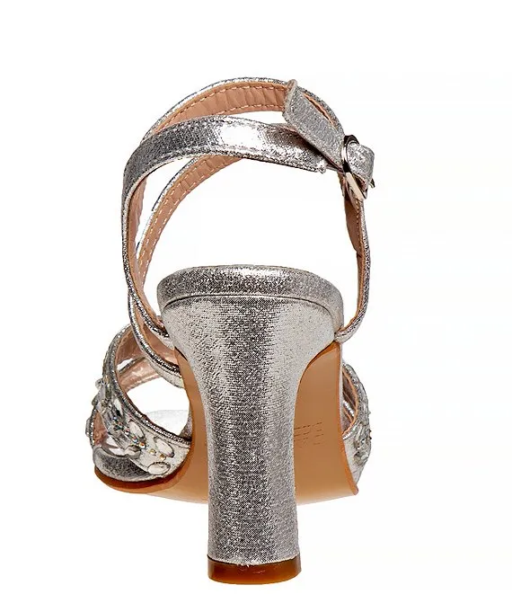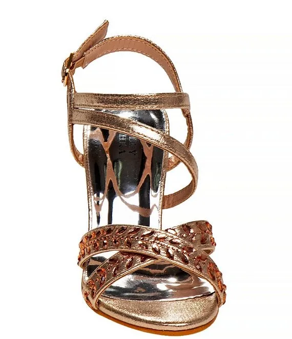 From Badgley Mischka, the Girls' Arianna Metallic Rhinestone Embellished Dress Sandals feature: