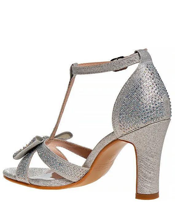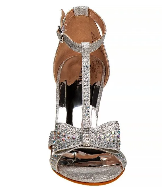 From Badgley Mischka, the Girls' Kayla Rhinestone Bow Heel Dress Sandals feature:
