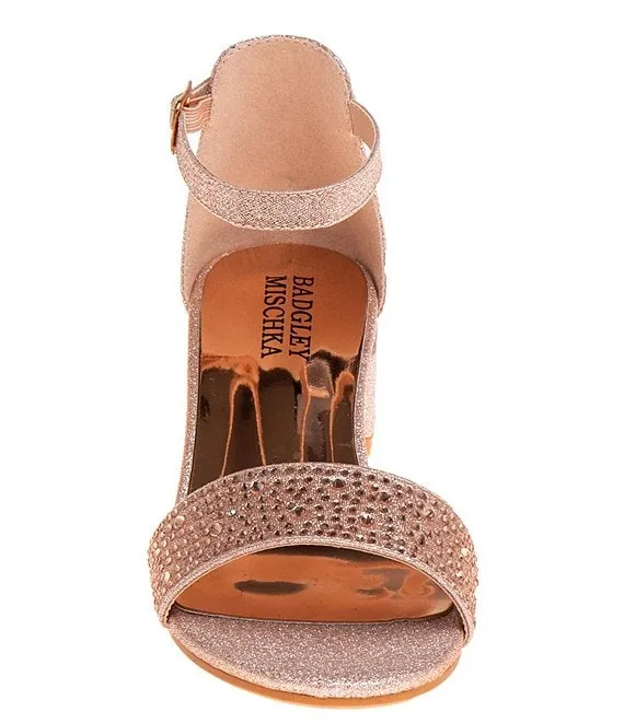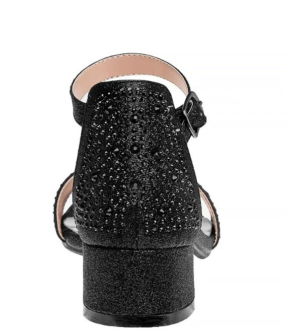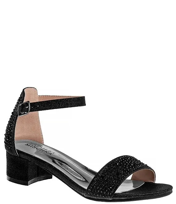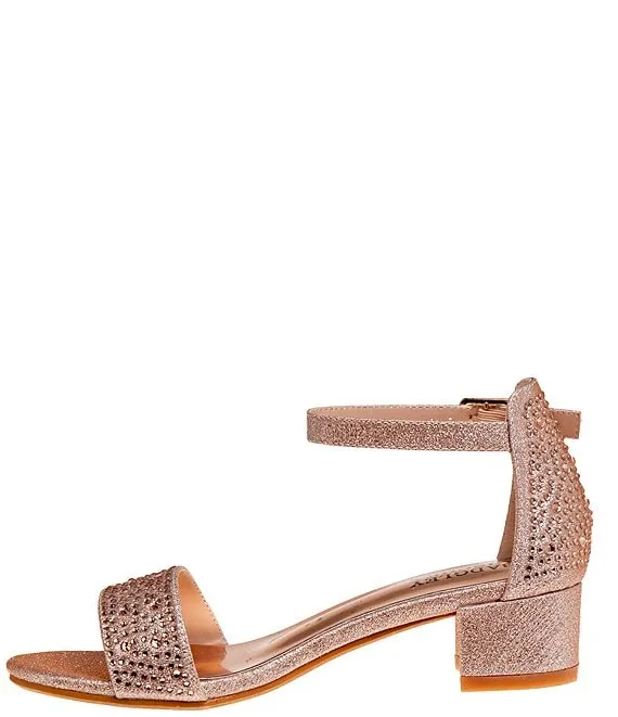 From Badgley Mischka, the Girls' Louise Metallic Rhinestone Embellished Dress Sandals feature: