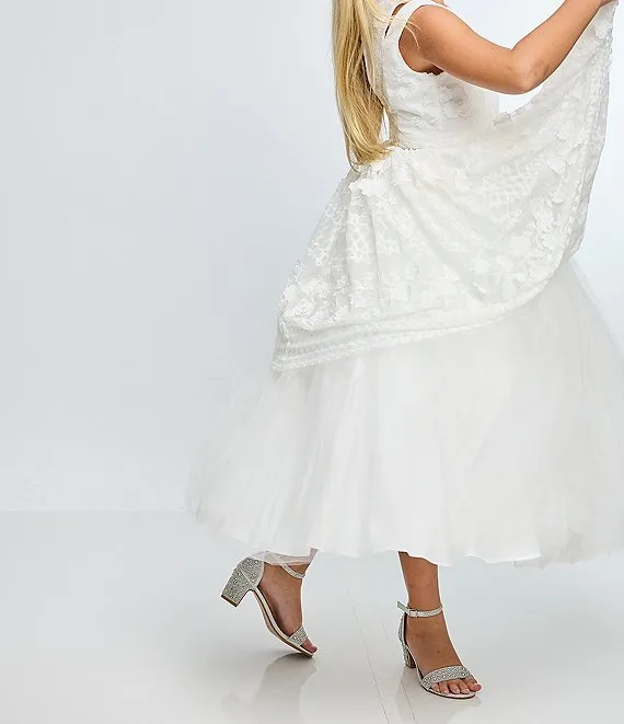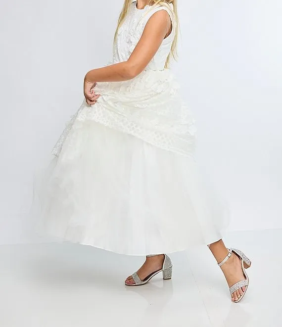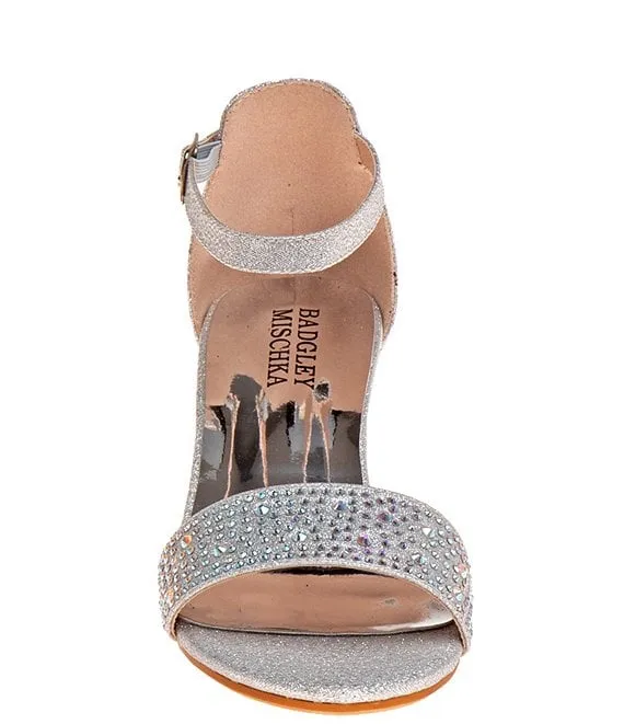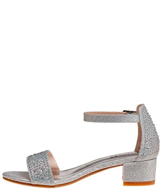 From Badgley Mischka, the Girls' Louise Metallic Rhinestone Embellished Dress Sandals feature:
