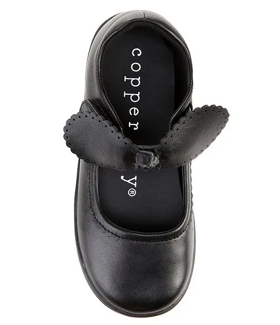 From Copper Key, the Girls' Teeny Scalloped Leather Bow Flats feature: