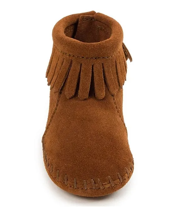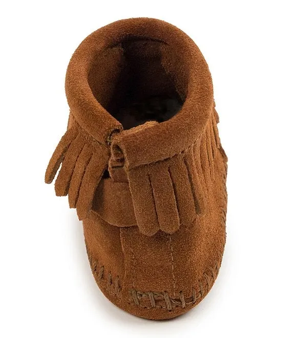 From Minnetonka, the Kids' Back Flap Bootie Crib Shoes feature: