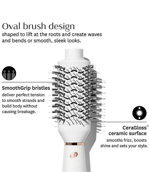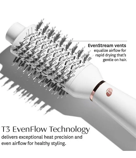 Meet your one-step solution for faster styling and healthy, salon-level blowouts. Designed to dry and style in one go, the T3 AireBrush hair dryer brush delivers exceptional heat precision and even airflow to cut styling time in half while protecting hair's natural moisture. EvenStream vents equalize airflow across the brush surface for faster drying with less damage. An oval brush design with perfect SmoothGrip bristle placement and a CeraGloss™ ceramic surface works to smooth strands, create bends, volumize, and boost shine. 3 heat and 2 speed settings deliver total styling personalization for healthy results on all hair types. Fast drying, big-time body and major shine—all in one easy step. Supercharge your blowout.