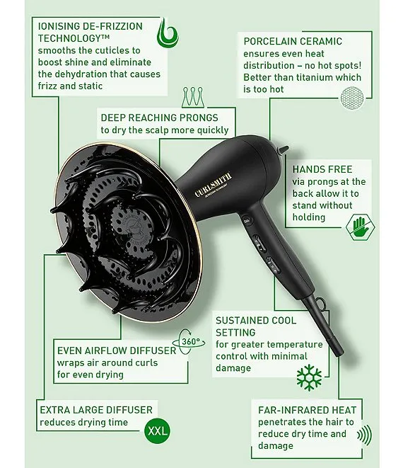 - XXL 8" diffuser for faster yet careful drying