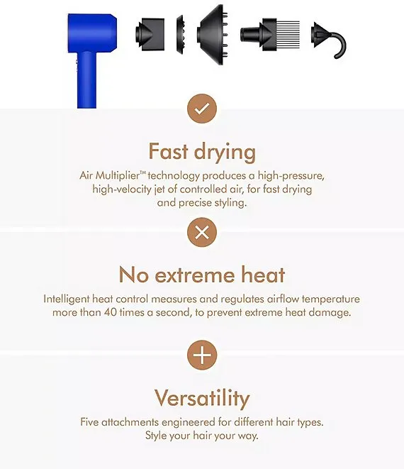 Intelligent heat control: The Dyson Supersonic hair dryer measures air temperature over 40 times a second and regulates the heat. This prevents extreme heat damage, to help protect your hair's shine.