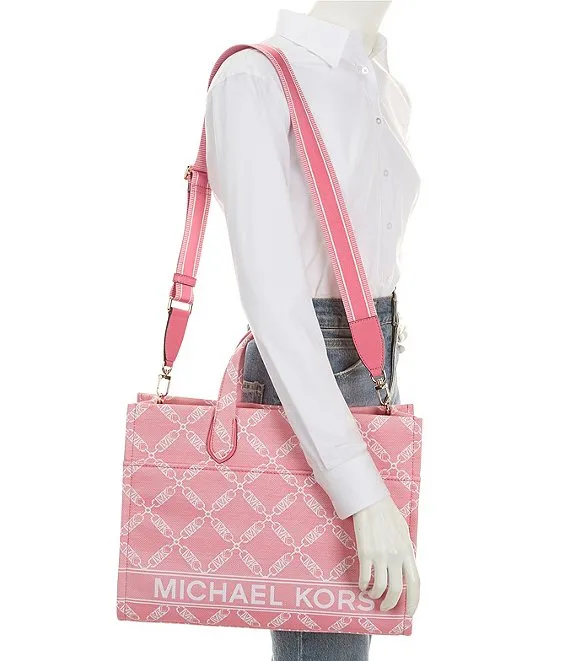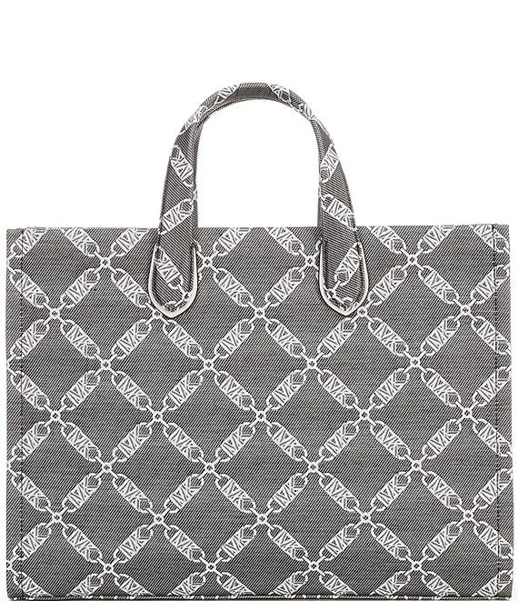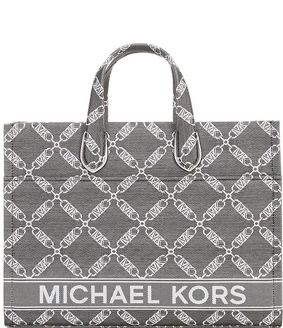 From Michael Kors, the Gigi Large Logo Chain Jacquard Grab Tote Bag features: