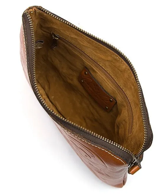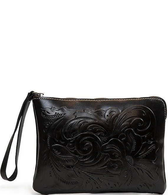 From the Rose Tooling Collection by Patricia Nash, the Cassini Floral-Embossed Leather Wristlet Clutch features: