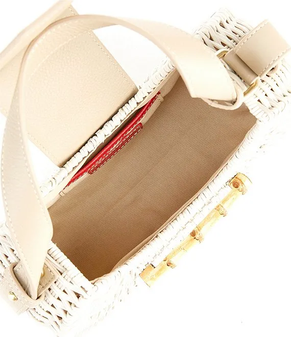 From J.McLaughlin, the Whittaker Straw Pebble Grain Leather Flap Wicker Bag features: