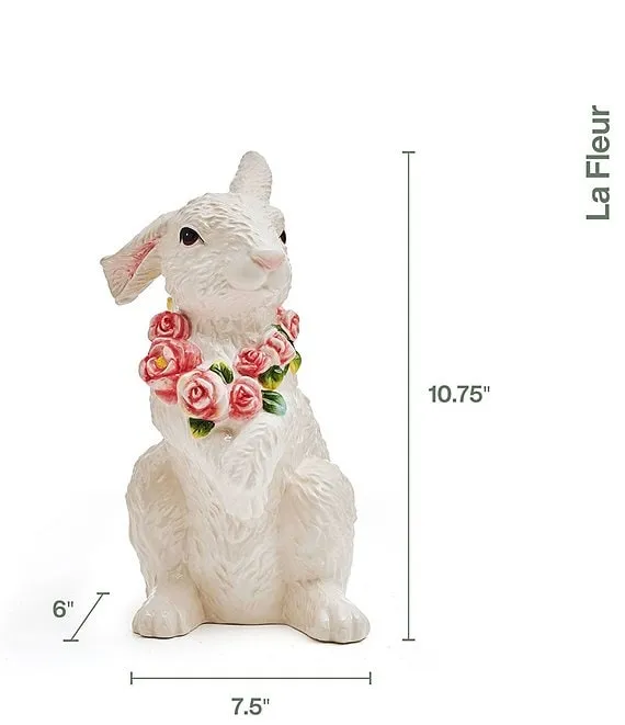 Perfect for use as springtime decor, an Easter focal piece, or all year round, this La Fleur Sitting Rabbit Figurine is stunningly crafted from durable, glazed earthenware for long-lasting beauty and hand-painted with attention to detail. The realistic design of the figurine is adorned with delicate flowers and adds a charming look to desks, dressers, shelves, or any other tabletop surface.