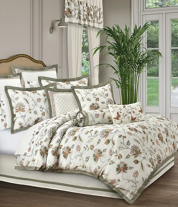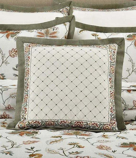- The outside border is framed and mitered on four sides with an intricately embroidered stripe in rust, sage, dark and light teal with accents of gold