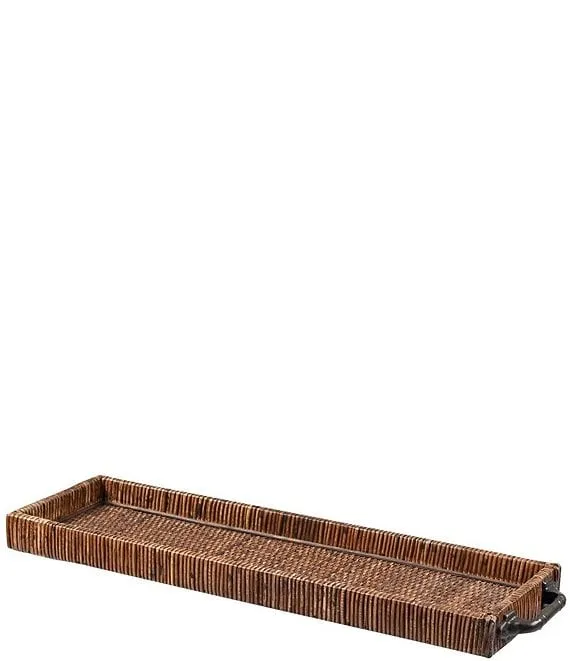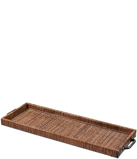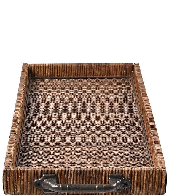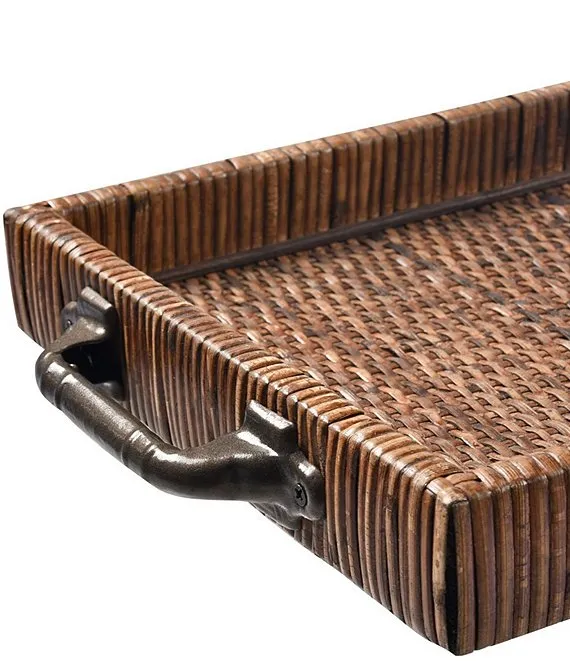 - The Bowman Trays, sold as a set of two, are rectangular woven rattan nesting trays with a rich brown finish.