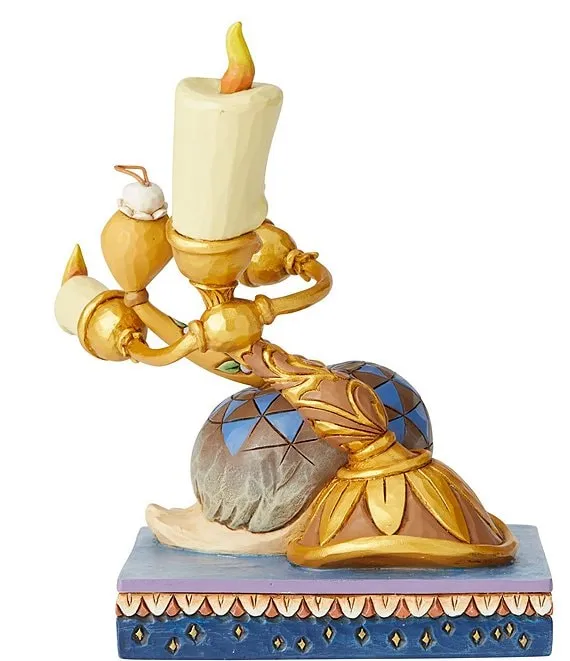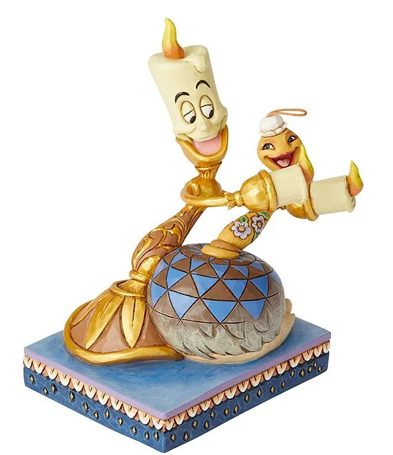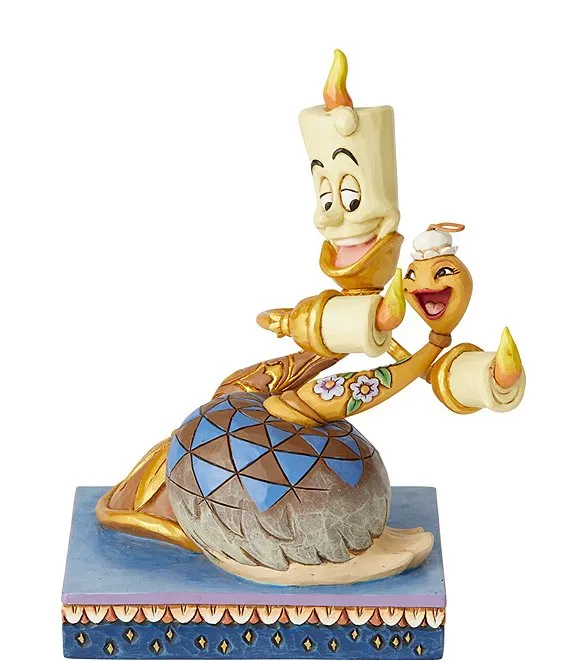 Lumiere and Feather Duster take moment for romantic dance in this Jim Shore figurine. Lumiere is dipping Feather Duster. These love birds don't waste a minute of their lives apart from each other and are constantly in a flirty mood with the other.