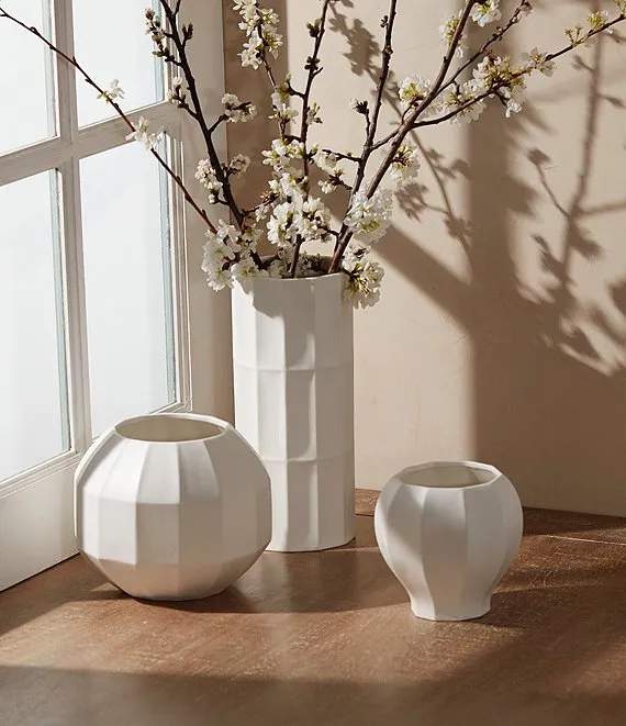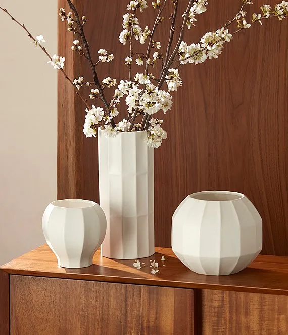 This timeless vase does double duty as a stunning home statement and catch-all accent. Featuring a linear design, its geometric-inspired appearance speaks to modern style. Made of porcelain and finished with a satin glaze.
