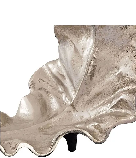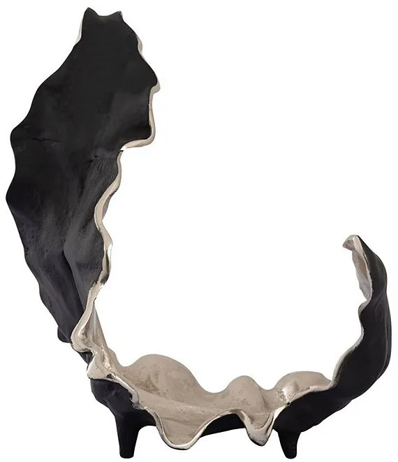 - A curled metal decorative object with a silver and black painted finish.