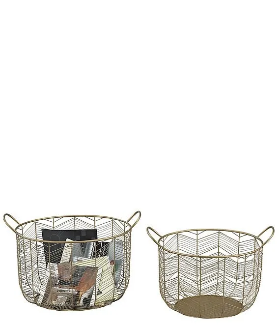 The Tuckernuck set of two metal woven baskets includes one smaller and one larger. An open frame chevron pattern has an Art Deco flair, and handles make these baskets easy to transport around the home.