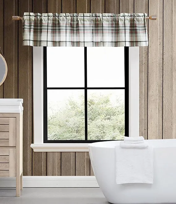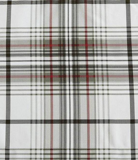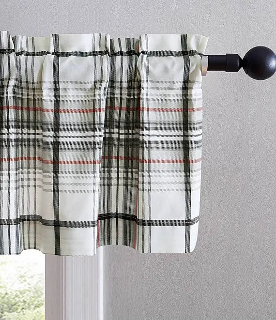 • Classic plaid pattern in a neutral palette of charcoal grey on white with a warm red accent
