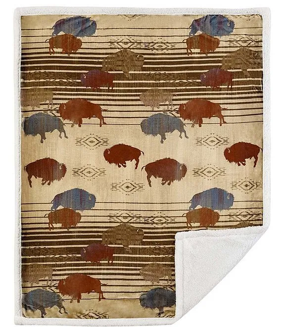 - Featuring a majestic buffalo herd roaming across a field of Southwestern patterns in earthy and sky-inspired colors