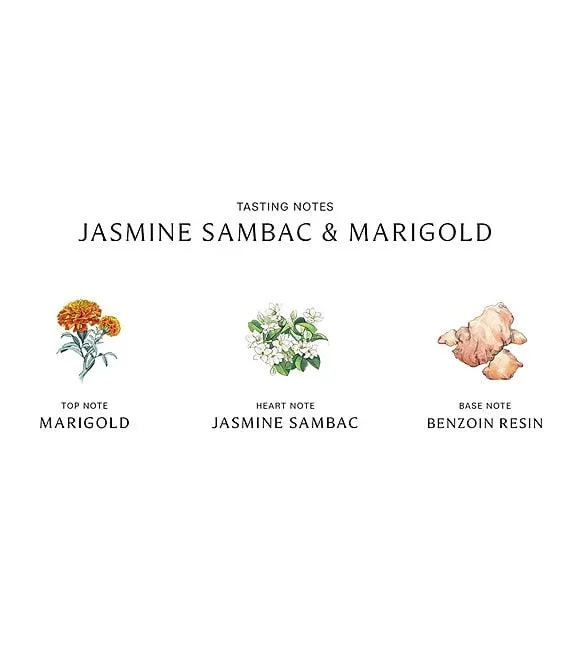 Fill the room with the potent floralcy of coveted jasmine sambac buds picked from Tamil Nadu's peaceful fields. Their potent floralcy contrasts with vibrant marigold, enveloped in the warmth of vanilla and amber. Crafted in the British countryside in a black glass design. Burn time approx. 45 hours. Lid included.