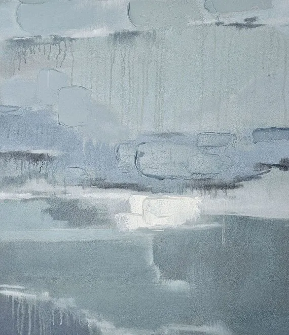 • Muted hues converge, drip and swirl, evoking a stormy sea, or a landscape at dawn