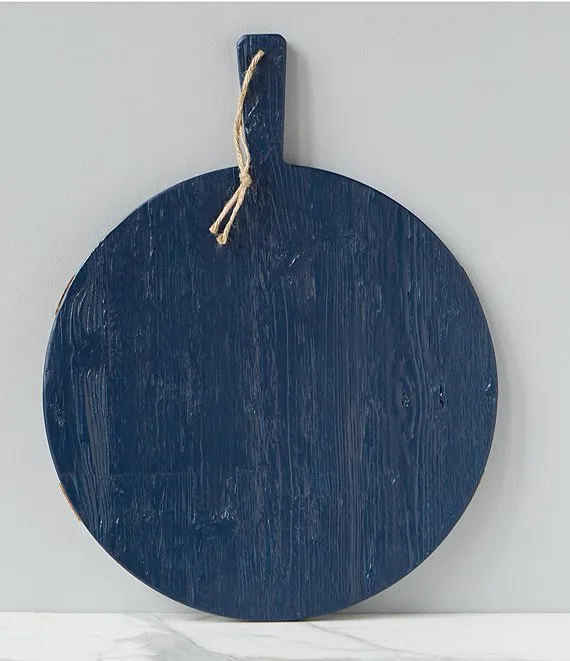 These reclaimed wood boards are distinguished by two strips of contrasting timber. For a modern spin, the serving board boasts a navy 100% plant-based, food-safe wax finish, and the slats have maintained their exquisite organic beauty. Ideal for use as a charcuterie plate, showcasing bread, cheese, or fruit, this board can also be used as a decorative kitchen accent.