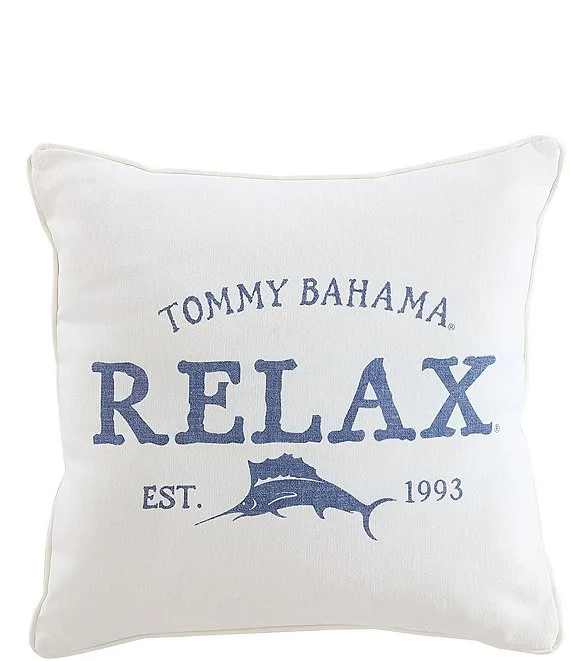 - The other included decorative pillow features the signature Tommy Bahama logo and the mantra "RELAX" in blue on the white ground