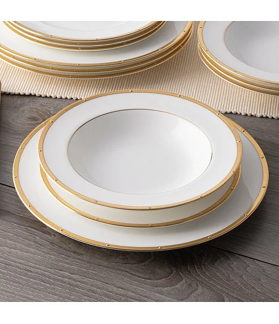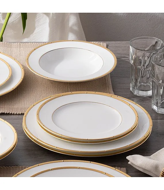 Crafted on classic bone china, Rochelle Gold is a fine dinnerware pattern with a band of etched gold with raised, gold dots for a classic look. Rochelle Gold offers traditional place setting components, additional items for individual service, and serving pieces. Rochelle Gold is suitable for daily use and is dishwasher safe.