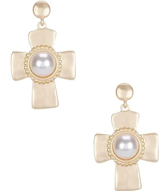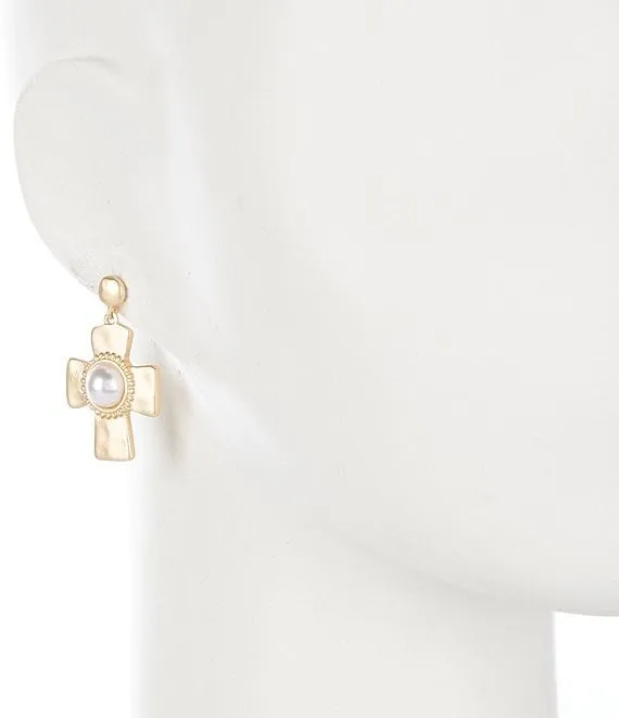 Pearl Cab Hammered Metal Cross Drop Earrings