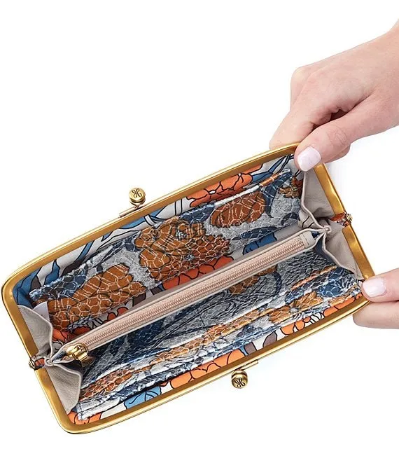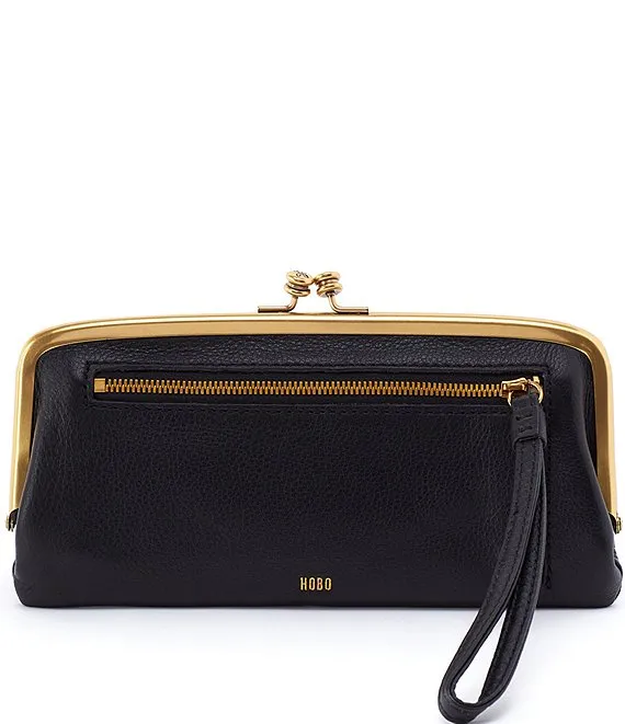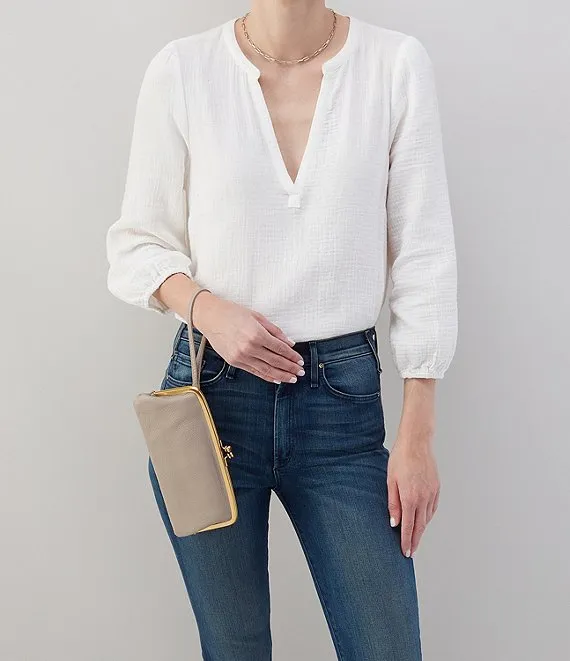 - Exterior Back: Zip pocket with wristlet strap zipper pull