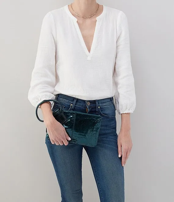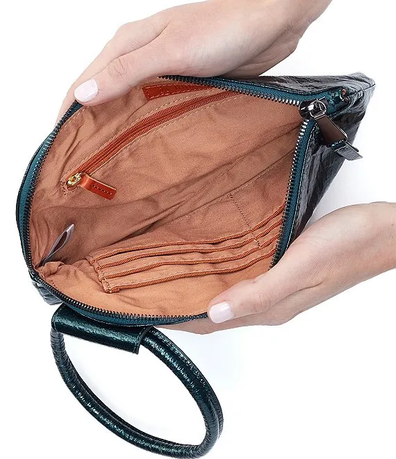 From HOBO, the Sable Leather Metallic Studded Wristlet features: