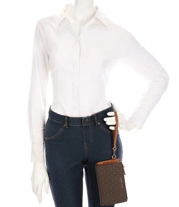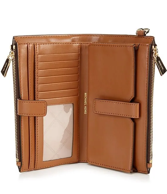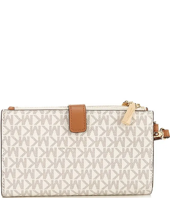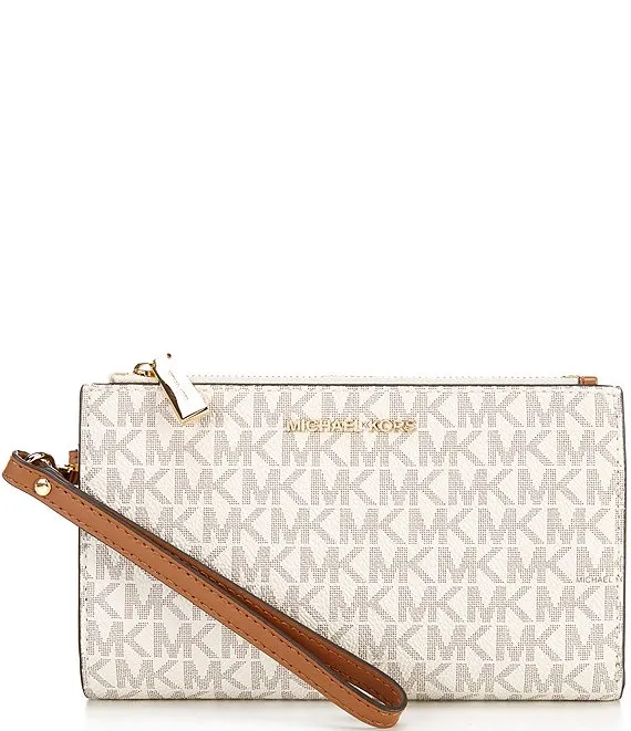 From Michael Kors, the Signature Logo Jet Set Double Zip Wristlet features: