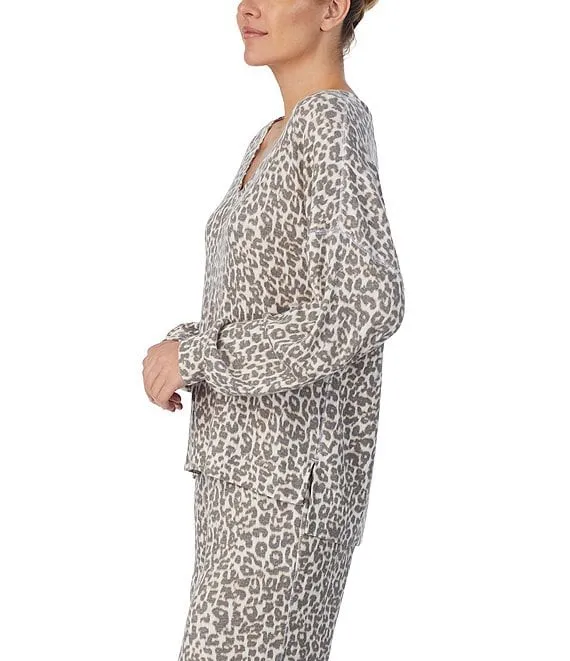 Brushed Marl Animal Print Long Sleeve V-Neck Coordinating Sleep Top