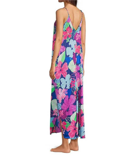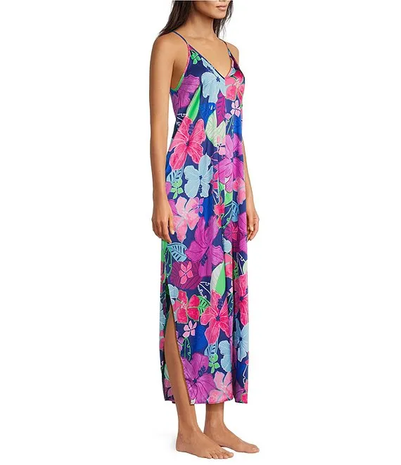 VAN WINKLE & CO. Hibiscus Print Woven Satin Sleeveless V-Neck Maxi Chemise