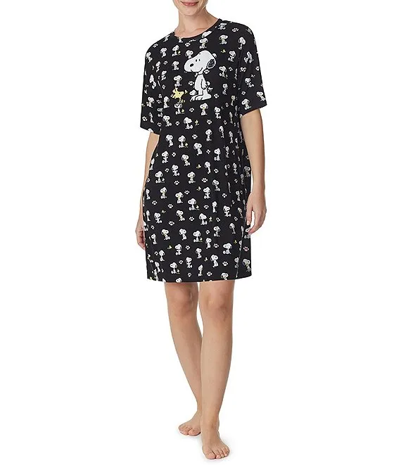 Jersey Knit Short Sleeve Round Neck Snoopy Print Nightshirt