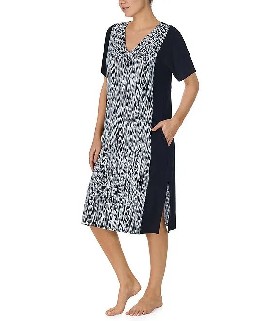 Knit Textured Ikat Print Short Sleeve V-Neck Nightshirt