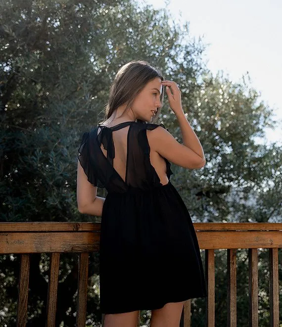 • Textured Satin Chiffon Deep V-Neck Short Sleeve Tie Back Lace Detail Ruffled Chemise